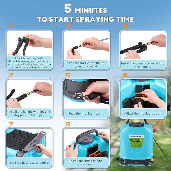 - Easy To Assemble The kit offers all accessories you need: mist nozzleĂ6ďźsingle nozzle, double nozzle, three nozzle, metal three nozzle, four hole pattern nozzle, six hole pattern nozzleďź, backrestĂ1, telescopic wandĂ1, shoulder strapĂ1, chargerĂ1, seal ringĂ4, 5.3 gal/20l water tankĂ1, etc . The installation is comprehensible and can be completed within 5 minutes by following the instructions.