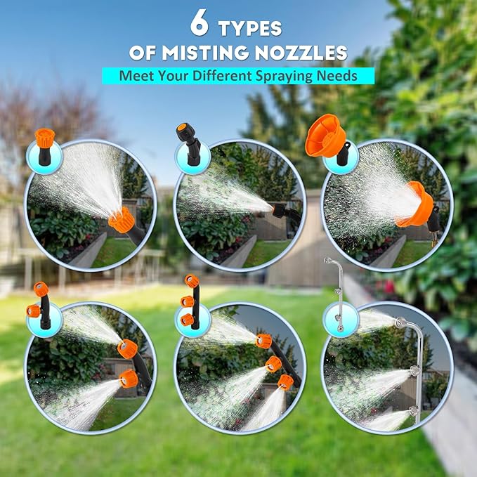 - Multiple Nozzles With 6 nozzles, this garden sprayer can provide various spraying methods, whether you spray fine mist for garden plants or straight stream for targeted areas. The max pressure can reach 101 PSI, providing more consistent and effective coverage. Also 5.28-gallon large tank ensures that you can handle larger areas without the need for continuous refilling. *NOTE: Every machine has been tested before shipped, so it's normal for there to be a small amount of water left in the tank!