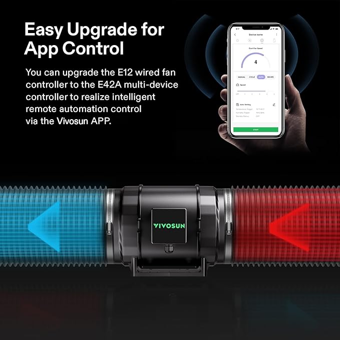 - E12 Speed Controller: Select from 10 fan speeds; easily adjustable via PWM technology; The controller features backup memory to retain the same setting after powering off/on; It enables creating automated wind speed cycles through 3 on/off timing modes to help conserve energy; The controller can be integrated with the App for intelligent remote control