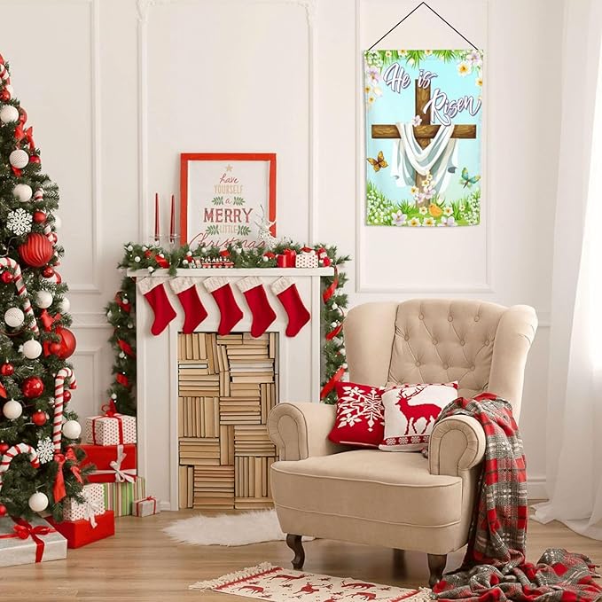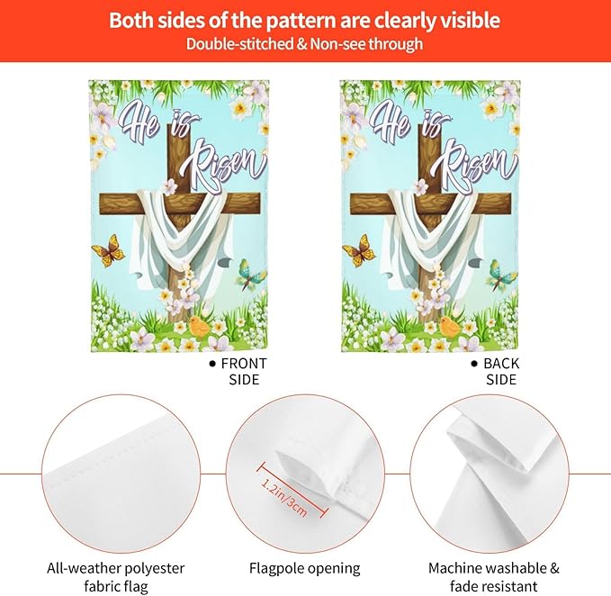 Christian Easter He Is Risen Cross Spring Garden Flag Welcome Party Outdoor Outside Decorations Picks Home House Garden Yard Decor 12x18 Inch