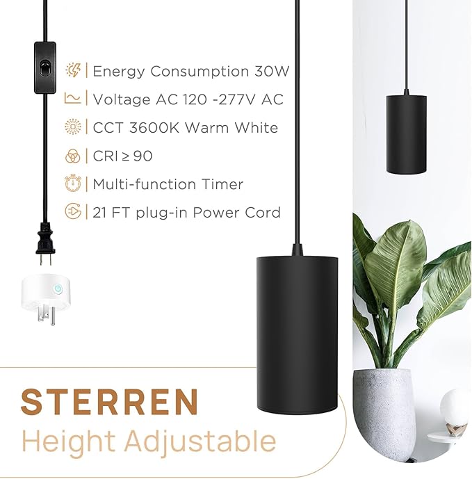 STERREN Hanging Grow Lights,Plug in Pendant Light for Indoor Plants,Full Spectrum Plant Light with ON/Off Switch, Auto Timer Decorative LED Grow Light with 21 FT Power Cord