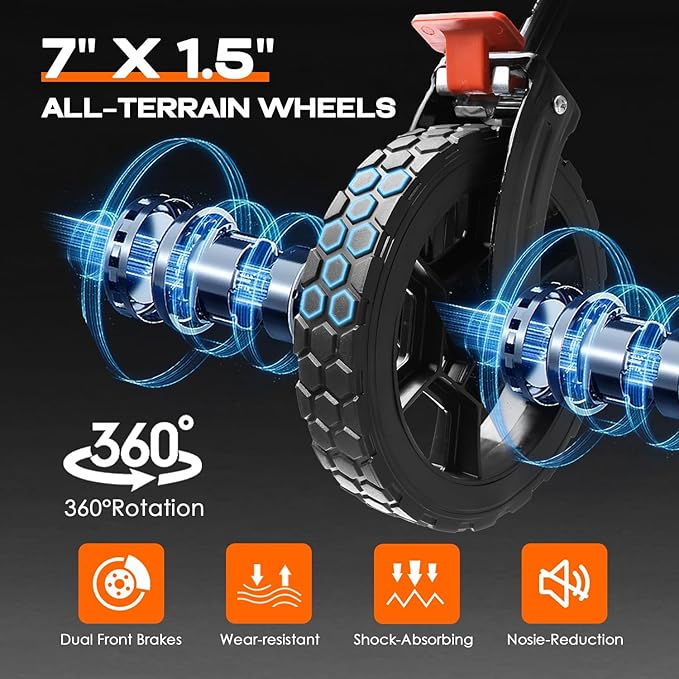 - DOUBLE SAFETY BRAKES : The 360°front wheel is equipped with a separate brake which locks both the wheel and the swivel simultaneously. When the brake is pressed down, holding the wheel firmly in place, it is effective to stop and ensures stability. With double bearing and brakes to bring a max loading capacity and safety. A saving of time and labor.