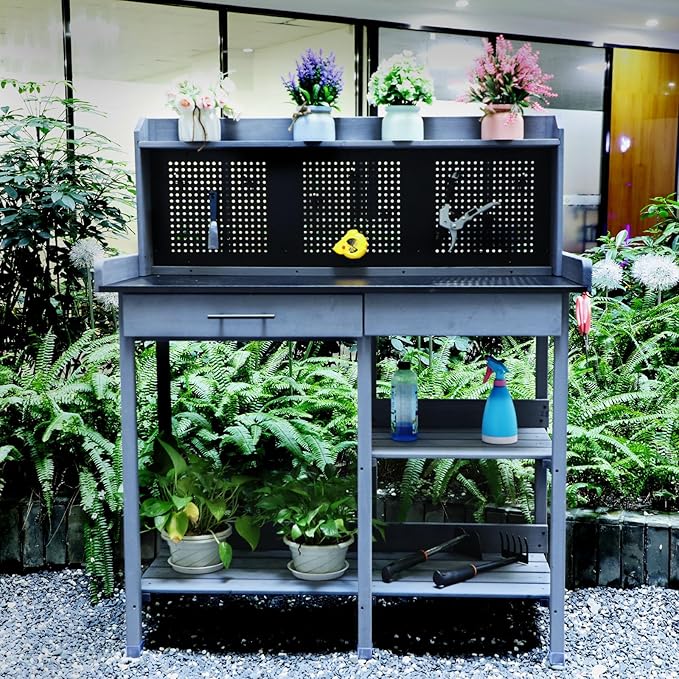 - 【Easy Assemble】:This potting bench is really an easy piece to assemble,features pre-drilled parts with a detailed manual, clear illustrations, and easy-to-understand instructions. And each part has a corresponding number to help you clearly understand each part and assemble it easily,A garden workstation table meets your different usage needs. You can use it as an indoor or outdoor bonsai table, or storage cabinetA great and practical present for gardener, friends, and family.