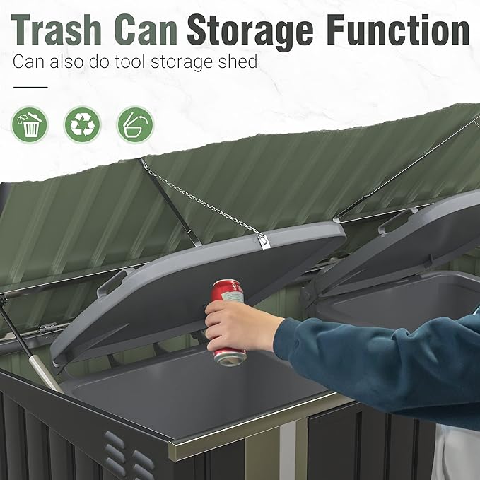 - OPTIMAL CAPACITY: The metal shed has the capacity to hold two large garbage cans; if used as a storage box, it can also hold many garden tools, outdoor toys. It only needs to take up a small space in your yard to keep your garden organized.