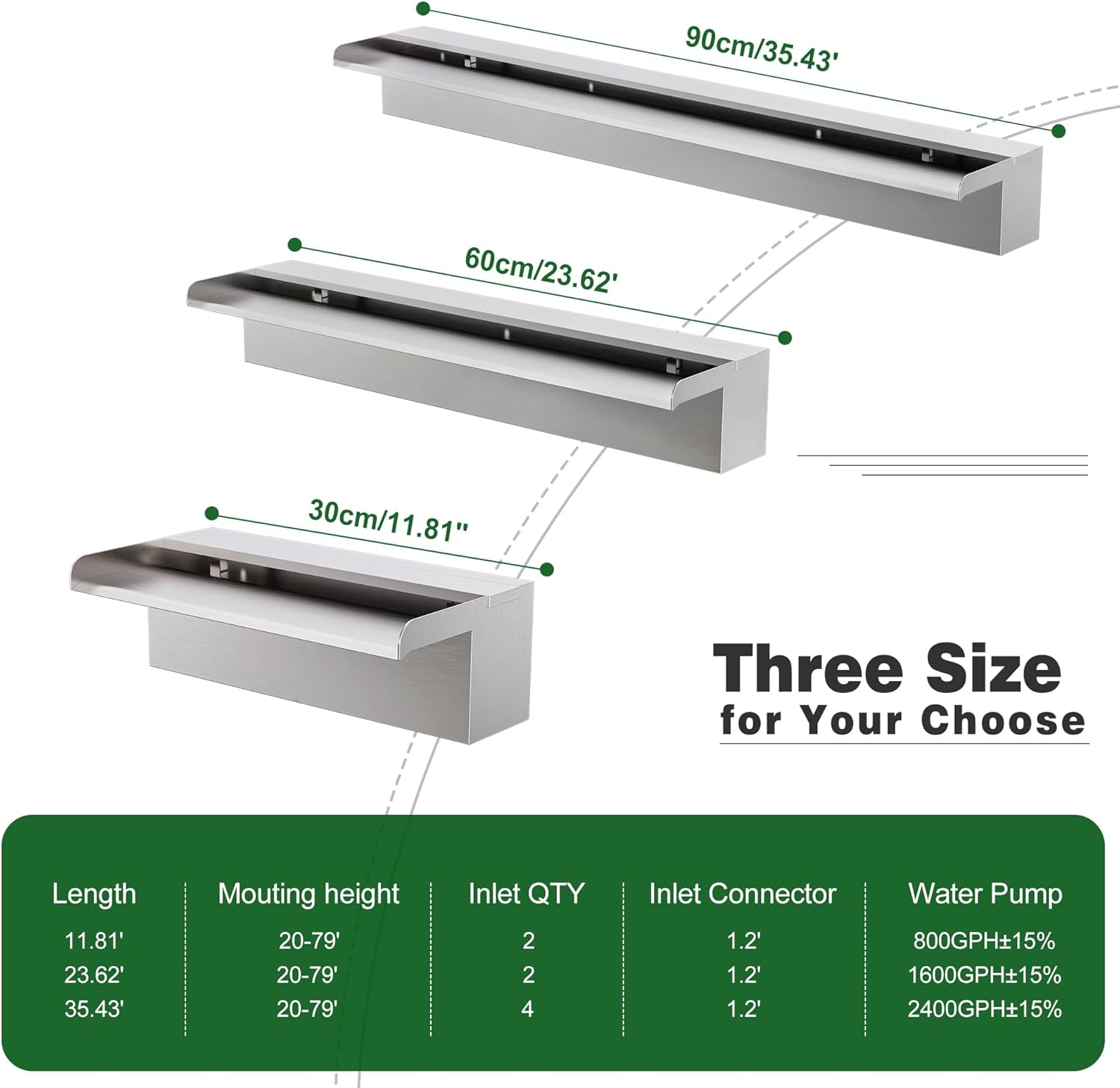 Waterfall Pool Fountain LONGRUNNEW 304 Stainless Steel 35.4" Rectangular Waterfall Spillway, Water Fall Fountain with Pipe Connector for Garden Outdoor, Swimming Pools, Fountains, Pond and Spa