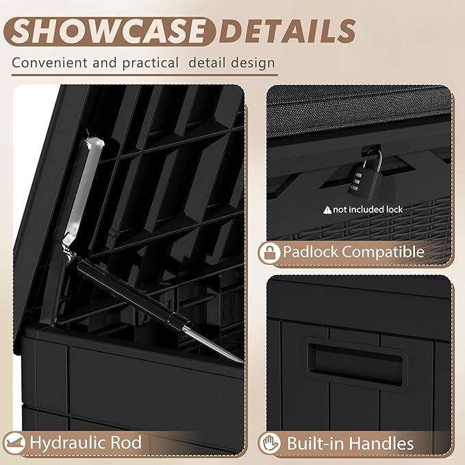 - Durable Resin Material: Deck box is made of waterproof resin, with a complementing rattan pattern design, effectively preventing fading and rusting, while also maintaining a fresh appearance even with all-weather use