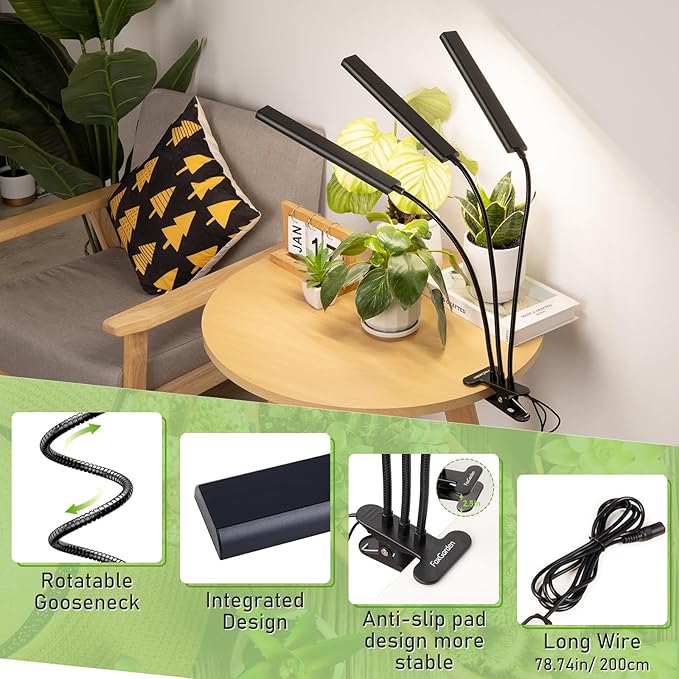 - Flexible Gooseneck & Sturdy clip: The FOXGARDEN plant light is designed with a versatile gooseneck and a sturdy clamp featuring anti-slip properties, ensuring effortless installation on any deskor plant stand. This setup allows you to position the grow light in any direction, enabling optimal lighting angles for comprehensive coverage around your plants. Additionally, the design is plant-friendly, with no extra components that could potentially harm your plants.
