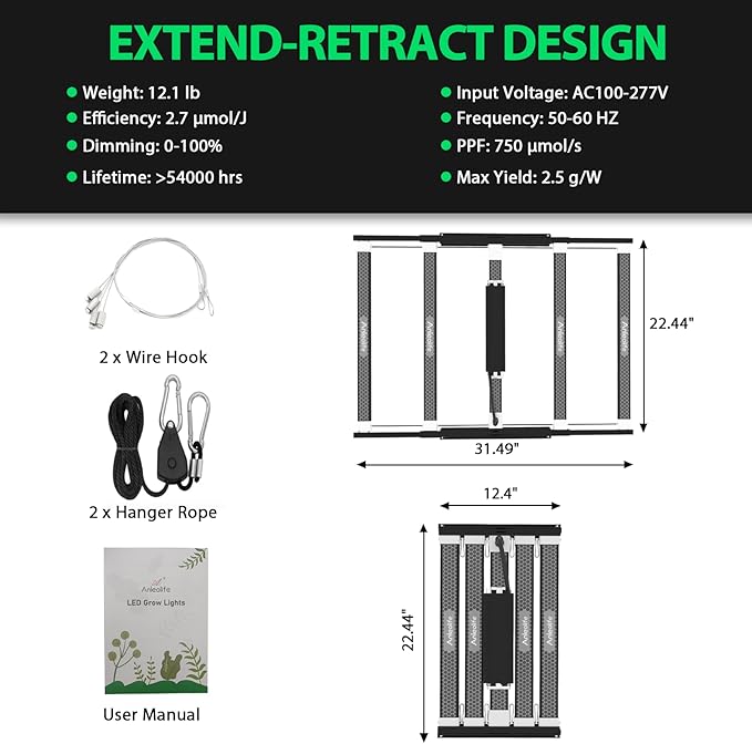 - Unique Extend-retract Design: Freely adjustable light bar spacing to suit different plant growth stages. Bar structure is lightweight, easy to install, plug and play