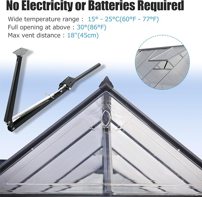 - No Batteries Required : Our automatic greenhouse window opener is completely self-sufficient and doesn't rely on batteries or electricity for operation. No additional power source is needed, saving you money and reducing environmental impact