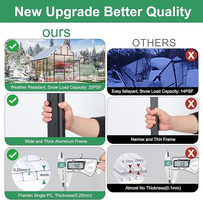 - 【Sturdy Frame】Our greenhouse kit boasts a robust rust-resistant aluminum frame designed to withstand various weather conditions. 2 skilled enthusiasts can assemble this greenhouse kit in just 4 hours. Introducing patented technology, Easy assembly, saving you 50% of your time. Gone are the days of tedious setups. With a simple push and locking screw, our Quick Connect ensures a reliable, secure, and swift link-up.