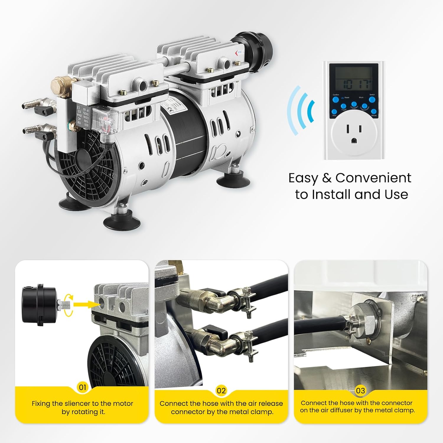 - Easy Installation β With the foot pads and silencer installed already, just connecting the air hose with the air-release connector on the air compressor by a metal clamp and connecting the air hose with the connector on the air diffuser via a metal clamp, plug the power cord to the socket and turn on the switch on the electrical box, the pond aerator for outdoor ponds could start to work