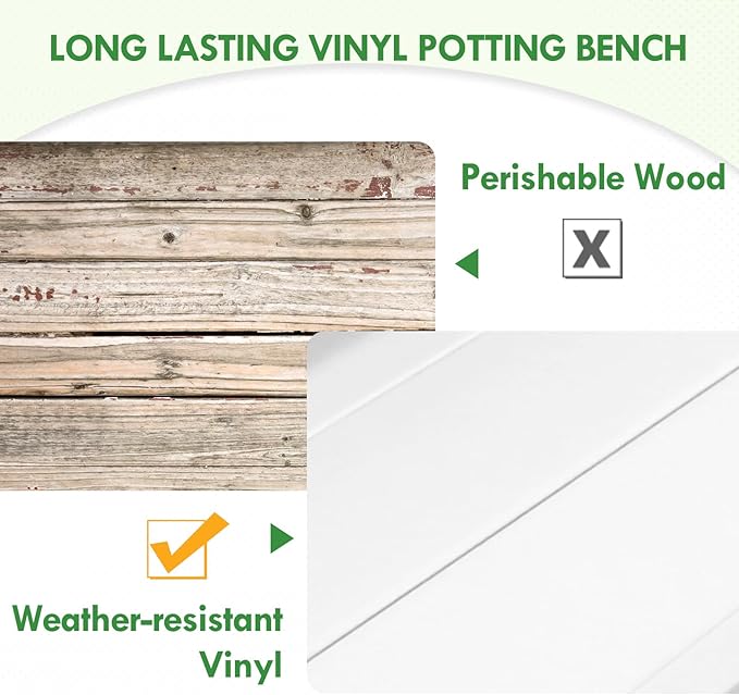 - STURDY PREMIUM VINYL: The EAGLE PEAK outdoor garden potting bench is made of high quality vinyl, which provides a waterproof, corrosion-resistant and maintenance-free workspace. It will not crack, fade, or peel allowing for years of dependable use.