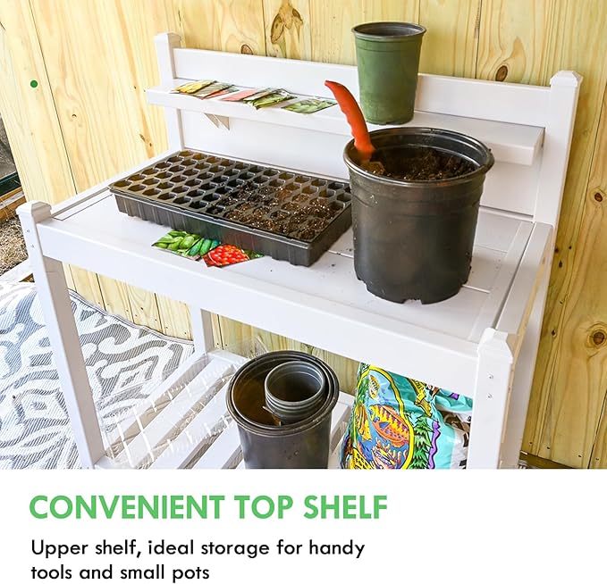 - LARGE STORAGE SPACE: The garden potting bench is crafted with an open top shelf and lower bottom storage shelf. Easily keep your gardening tools, flower pots, and additional supplies organized. Weight capacity of the lower shelt is 77 lbs.