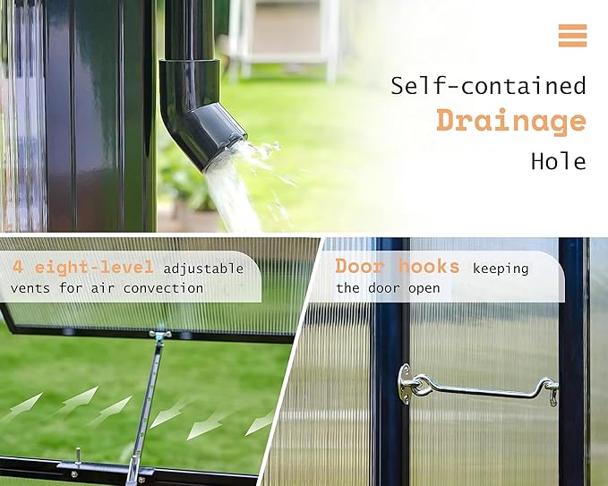 - Premium Material: The garden greenhouse equipped with 6mm Twin-wall translucent PC panels(UV Protection 99.99%), a rust-resistant aluminum frame (1.5mm)οΌ4 upgraded, thickened, and wider uprights, ensuring robustness and long-lasting durability