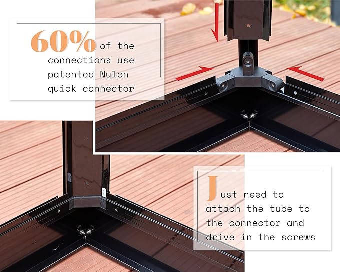 - Quick Connector Fast Assembly: The backyard greenhouse features an innovative quick connector system, used for over 10 years, 60% of the connections use quick connector, 3 DIY enthusiasts can erect in 8 hours by saving half time of the others