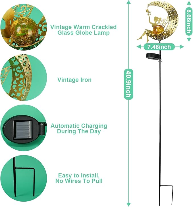 - 【 Unique Design 】 A dreamy fairy tale decoration, with a butterfly fairy sitting on the moon caressing the pendant. During the day, it serves as a decorative garden post and outdoor statue, adding fun to your garden. At night, romantic and warm fairy tale lights create a dreamy fairy tale atmosphere, turning your garden, courtyard, and flower bushes into a dreamy kingdom.