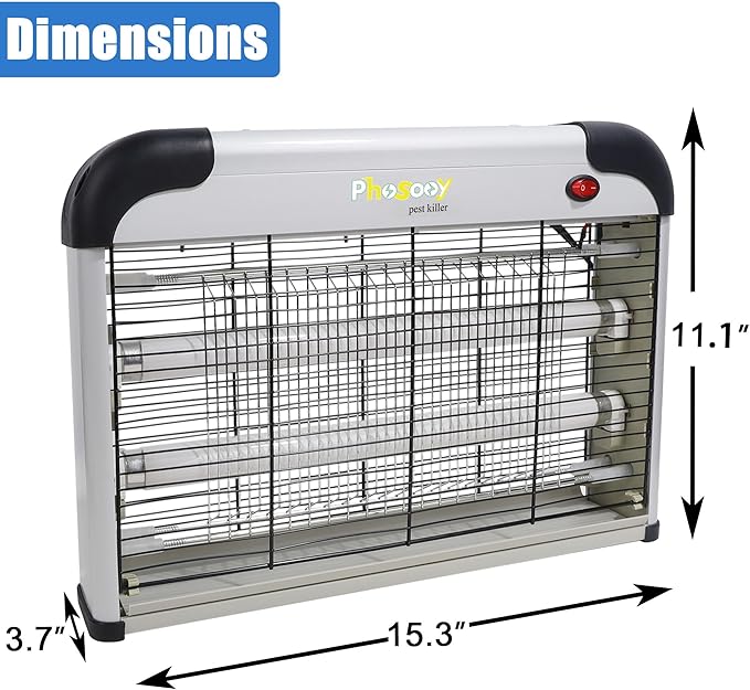 - EPA Est. No. 96992-CHN-1/EFFICIENT INSECT CONTROL: Phosooy electric fly killer emits a 365nm-wavelength blue light using its 20W bulbs to attract fruit flies, moths, mosquitoes and other flying insects. And then, the internal metal grids with a high voltage of 2800v effectively electrocute these insects.
