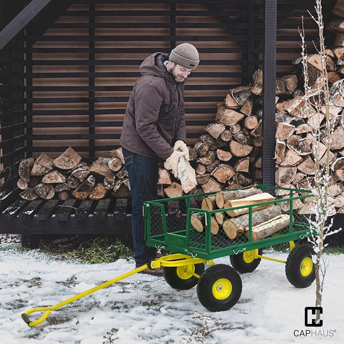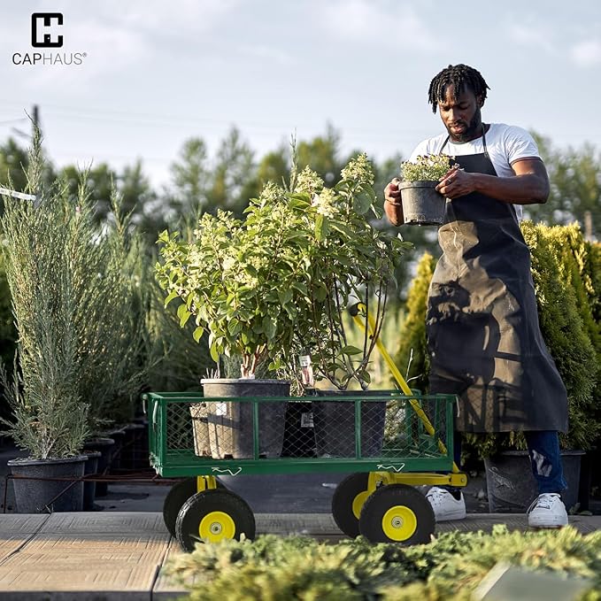 CAPHAUS Metal Green Garden Cart, w/ 180° Adjustable Yellow Handle, w/Mat and Strap, Heavy Duty 880 lbs Capacity, w/ 10” Flat-Free Tires, Sides Removable, Utility Wagon, Yard Cart, for Garden, Farm