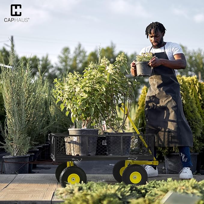 CAPHAUS Metal Black Garden Cart, w/ 180° Adjustable Yellow Handle, w/Mat and Strap, Heavy Duty 880 lbs Capacity, w/ 10” Flat-Free Tires, Sides Removable, Utility Wagon, Lawn Cart, for Garden, Yard