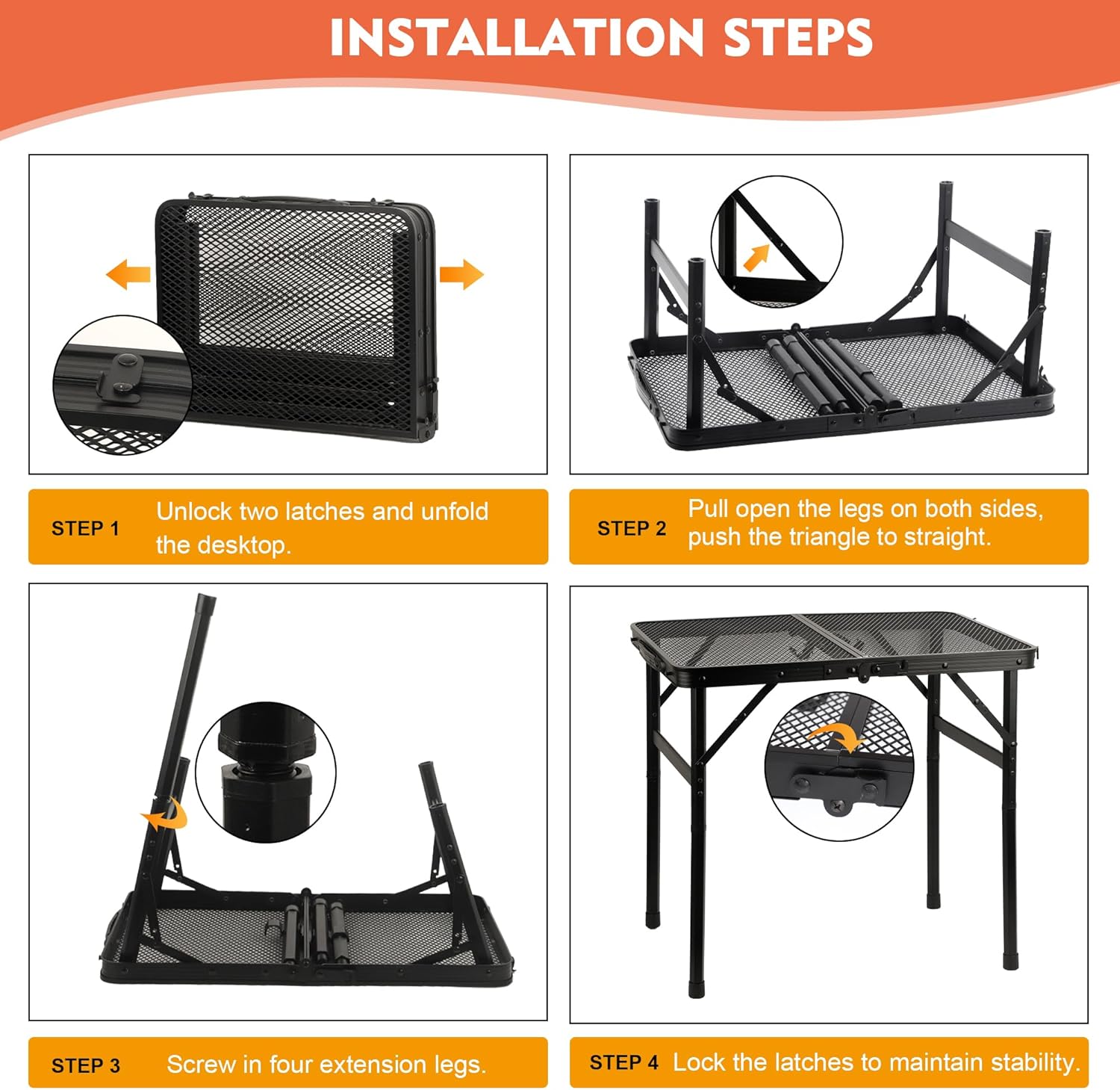 - Easy to Clean: The top of this folding table features an iron mesh design that resists heat, water and rust. Allows spills and crumbs to pass through for easy cleaning and maintenance.