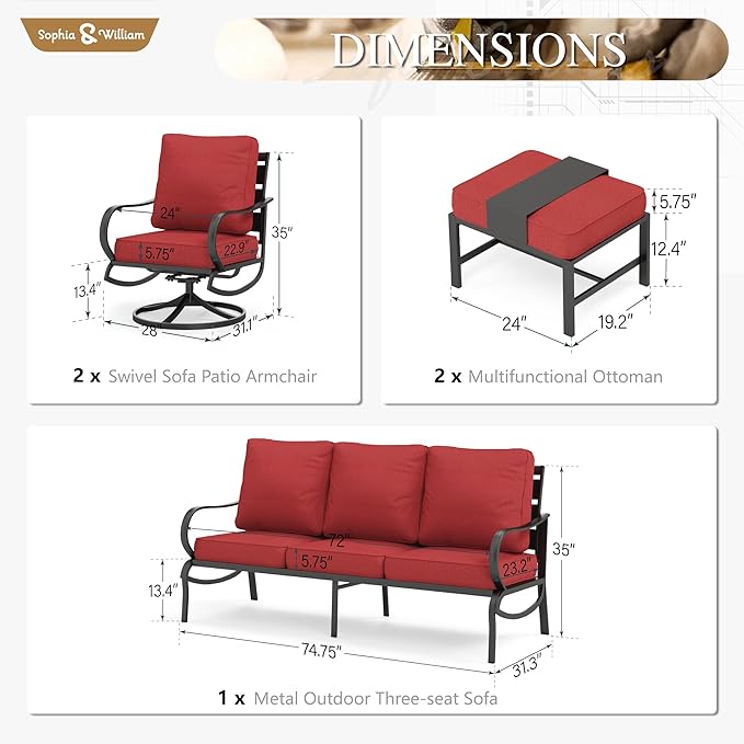 Sophia & William Patio Furniture Sets for 5 Outdoor Metal Conversation Sets 5 Pcs with 2 x Cushioned Swivel Sofa Chairs, 2 x Ottomans as Coffee Table, 1 x 3-Seat Sofa, Lawn Backyard Poolside Red