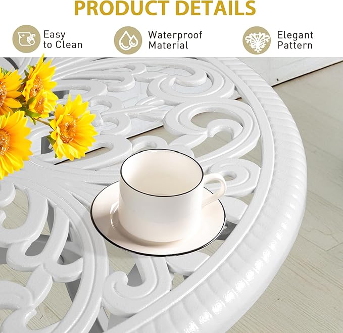 - PREMIUM CAST ALUMINUM: Crafted from high-quality cast aluminum, this round bistro table is built to withstand the elements. With exceptional durability, weather resistance and rust-proof features, it ensures long-lasting outdoor enjoyment with minimal maintenance required