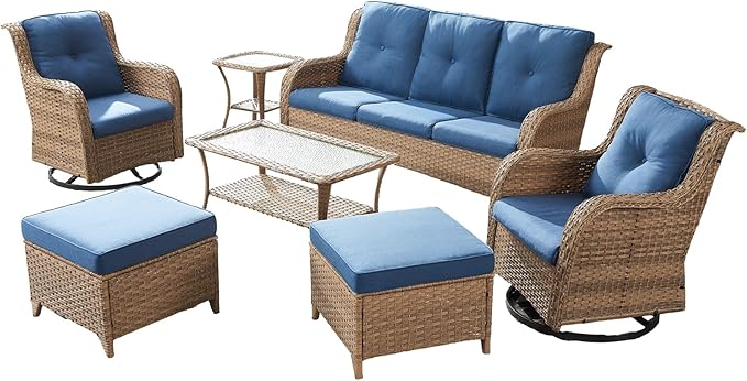 - Patio Furniture Sets: This outdoor furniture includes 1 x 3-seater sofa, 2 x ottomans, 2 x outdoor swivel chairs, 1 x coffee table and 1 x side table that provide seating for up to 5 people. Hand-woven rattan adds texture to the outdoor sofa, the patio conversation set can be widely used on patio, porch, backyard, balcony, poolside and gardens, providing a comfortable conversation space for you and your guests