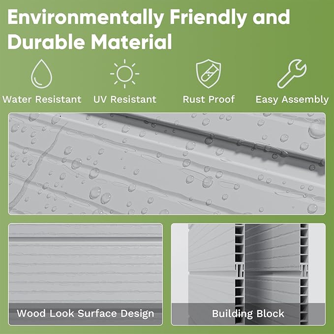 - Weather Resistance: Crafted from durable resin material, this shed offers excellent weather resistance, ensuring your belongings stay safe and protected year-round. The UV-resistant exterior finish ensures long-lasting color vibrancy and protection against fading caused by sun exposure.