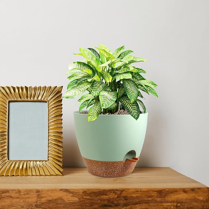 10 inch Self Watering Pots, 2 Pack Plastic Planters with Mesh Drainage Holes for Garden Plants and Flower, Plants Pots with Deep Reservoir for Indoor Outdoor Plants, Green with Brown