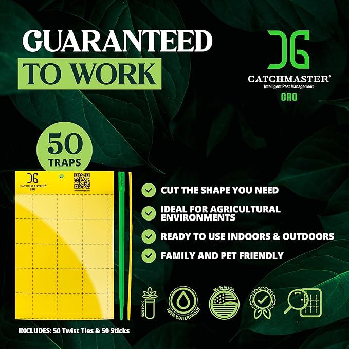 Catchmaster GRO Yellow Large Double Sided Sticky Traps 50PK, Adhesive Bug & Fruit Fly Trap, Pest Control for Home, Farm, Garden, Hydroponics & Greenhouse, Protect Live Plants Indoor & Outdoor