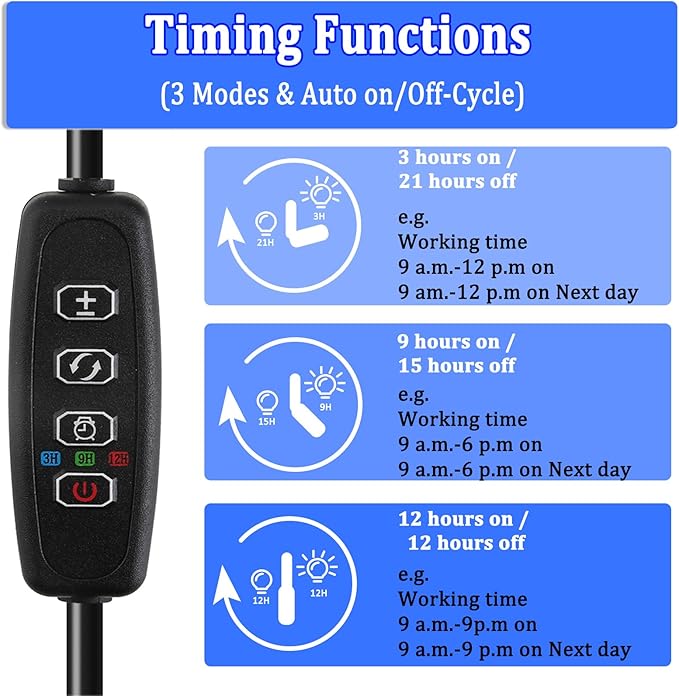 - 【TIMER & AUTO On/ Off】Plant grow lights can be set 3,9,12 hours timer, bring enough brightness to your indoor plants. Besides, equip with auto on/off function, there is no worry about your plant lack of lighting when you go outsides or travel. When set up, indoor plant lamp will auto keep 3/9/12H ON and 21/15/12H OFF each 24 hour period once timer activated. (NOTE: The function need the power always on);