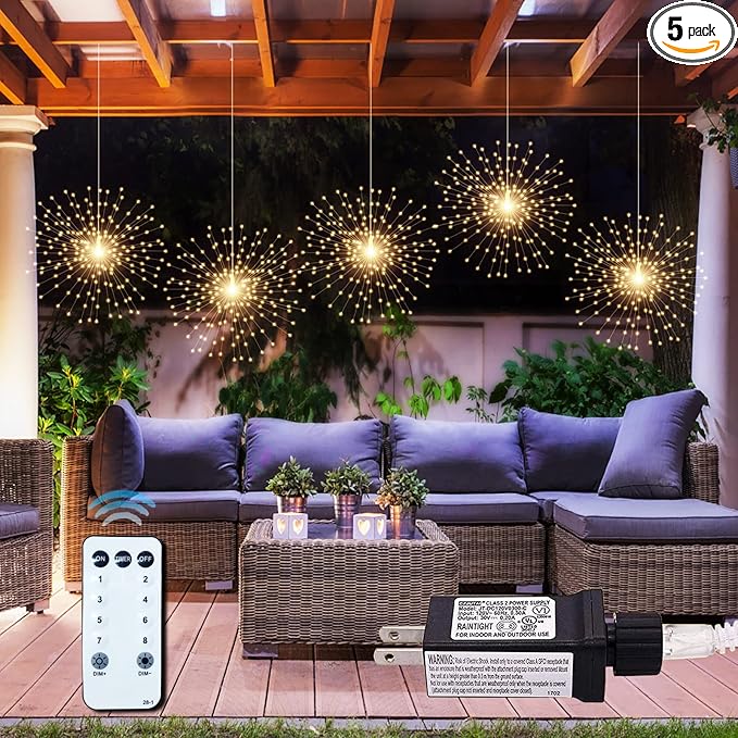 - 【UPGRADE PLUG-IN STARBURST LIGHTS】The starburst sphere light has been upgraded. The indoor firefly lights will be connected to the end of the 1pc 200LED firework lights and upgraded to 5pc 1000LED to insert the firework lights. This plug-in starburst light also has a hook, one end of the connection adapter can be removed, and the suspension wire and lead are long enough.