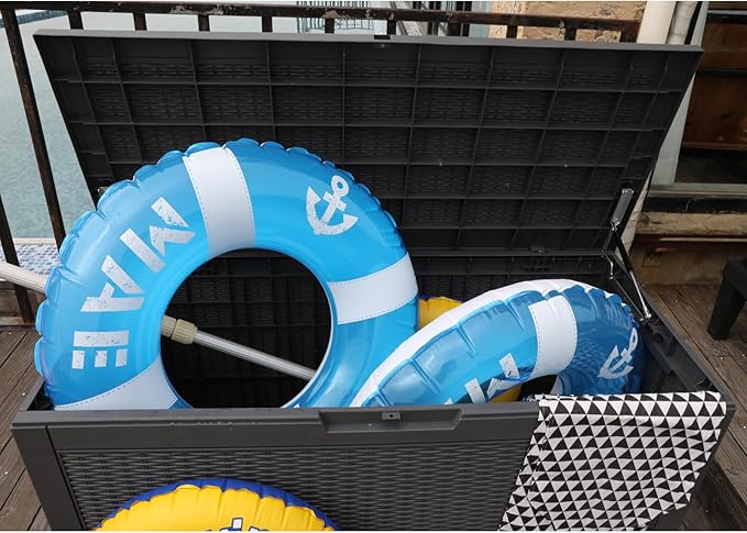 - Safe and Secure: This storage deck box with lockable lid will keep your items safe and secure. Perfect place to store outdoor patio furniture cushions, pool accessories, and beach towels. Space has been reserved for locking, and you need to purchase an additional lock yourself. It is recommended to purchase a skinny lock to apply to this product.