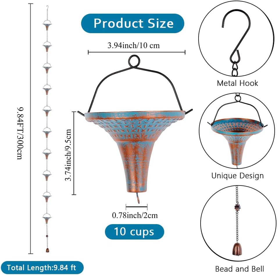 - Unique Designs: The rain chain downspouts are beautifully combined with 10 funnel-shaped cups. The bell pendant at the bottom will make a clear sound in the wind and rain, so you can hear a concert from nature on a stormy day