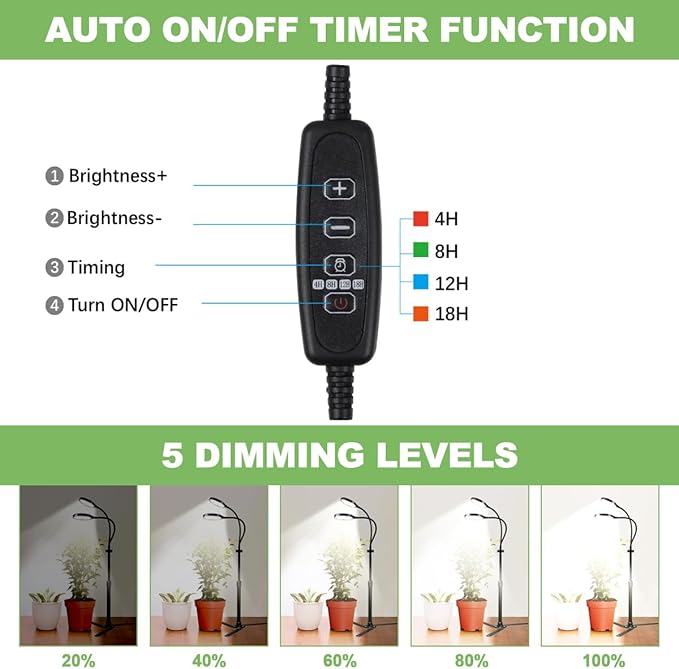 - Auto Timer 4/8/12/18Hrs - when kept plugging in, the stand growing lamp will auto on/off and no more manually operation everyday. The light intensity is also adjustable with a controller, so you make sure your plants have enough light.