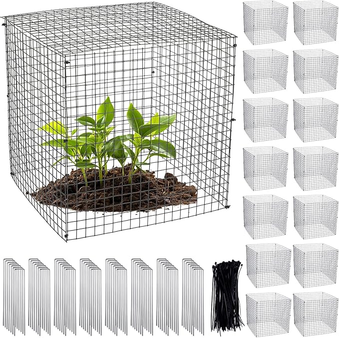 Zubebe 14 Pack Small Wire Plant Protectors Square Plant Protectors from Animals Mesh Cage Chicken Wire Cloche for Shrubs and Vegetables with Ground Stakes and Nylon Ties (12 x 12 Inch)