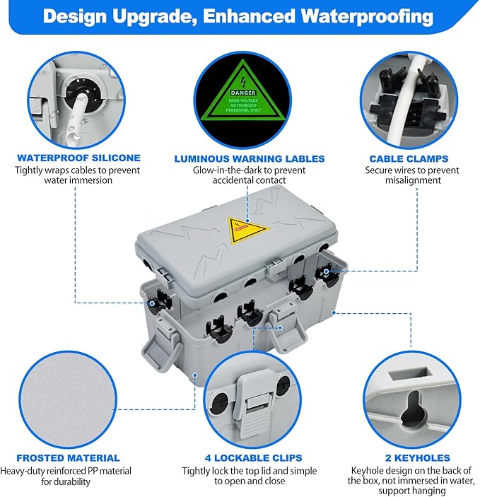 - LUMINOUS SAFETY WARNING LABEL: the lid of the outdoor electrical box has a luminous warning label that glows at night to prevent accidentally touching it, ensuring the safety of your family and pets.