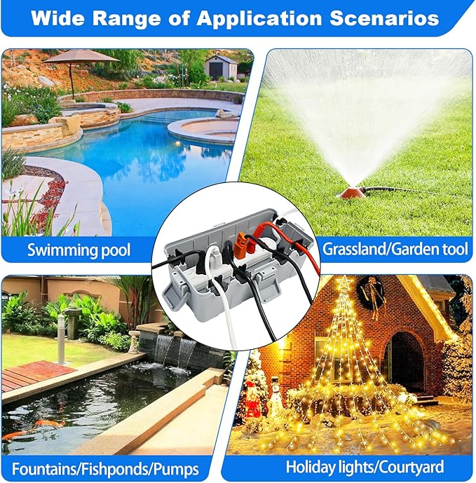 - WIDE APPLICATIONS:Ideal for a variety of outdoor & indoor applications including patio, lawn and garden power tools,holiday lighting, landscape decorations, pool pumps, fountains, fish ponds, patio heaters, hot tub, air conditioners, security cameras and more.