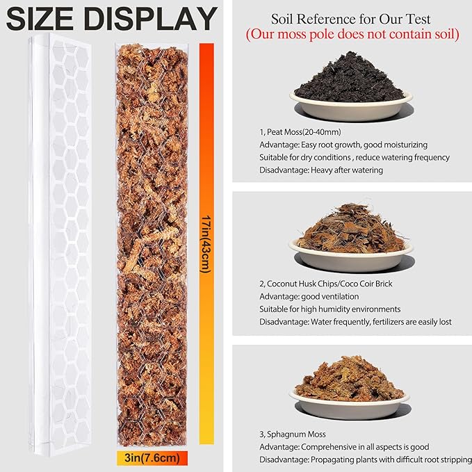 - [Perfect an Ideal Growth Environment] We strongly suggest using sphagnum moss or Coconut soil or soil mix with our plant sticks for best effect because it can provide water and micronutrients for creeping plants for a long time. Besides, our product will not end up rotting even if it stuck inside the soil for too long.