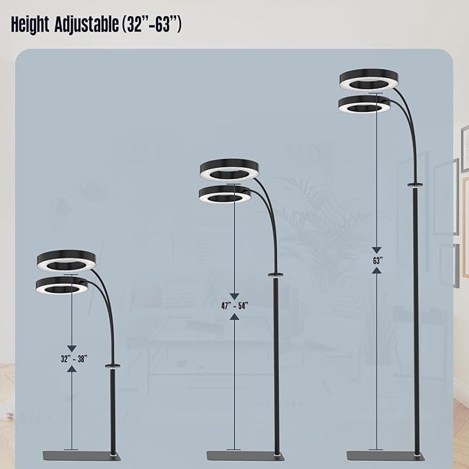 - 【Versatile Height Adjustment】Easily adjust the GLOWRIUM grow lamp to heights of 32, 47, or 63 inches with its detachable three-section design. The 360-degree rotating lamp head ensures your plants receive uniform light for optimal growth, from seedlings to full-sized plants.
