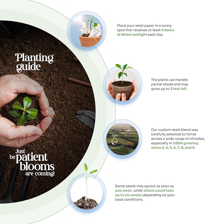 - For best results, place your seed paper in a sunny spot that receives at least 4 hours of direct sunlight each day. The plants can handle partial shade and may grow up to 3 feet tall. Our custom seed blend was carefully selected to thrive across a wide range of climates, especially in USDA growing zones 3, 4, 5, 6, 7, 8, and 9. Some seeds may sprout as soon as one week, while others could take up to six weeks depending on your local conditions. Just be patient — blooms are coming!