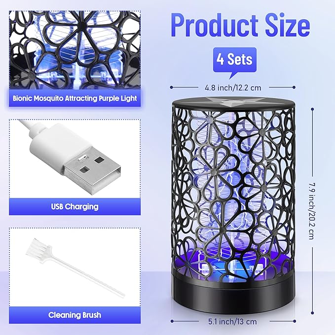- Multiple Devices Available: our mosquito killer lamps are powered by usb and are suitable for mobile phone chargers, power banks, laptops, USB sockets; It can be carried whether it is camping, night fishing, or outdoor activities; Our set includes 4 mosquito killer lamps that can effectively and comprehensively cover different areas of the house or outdoor space