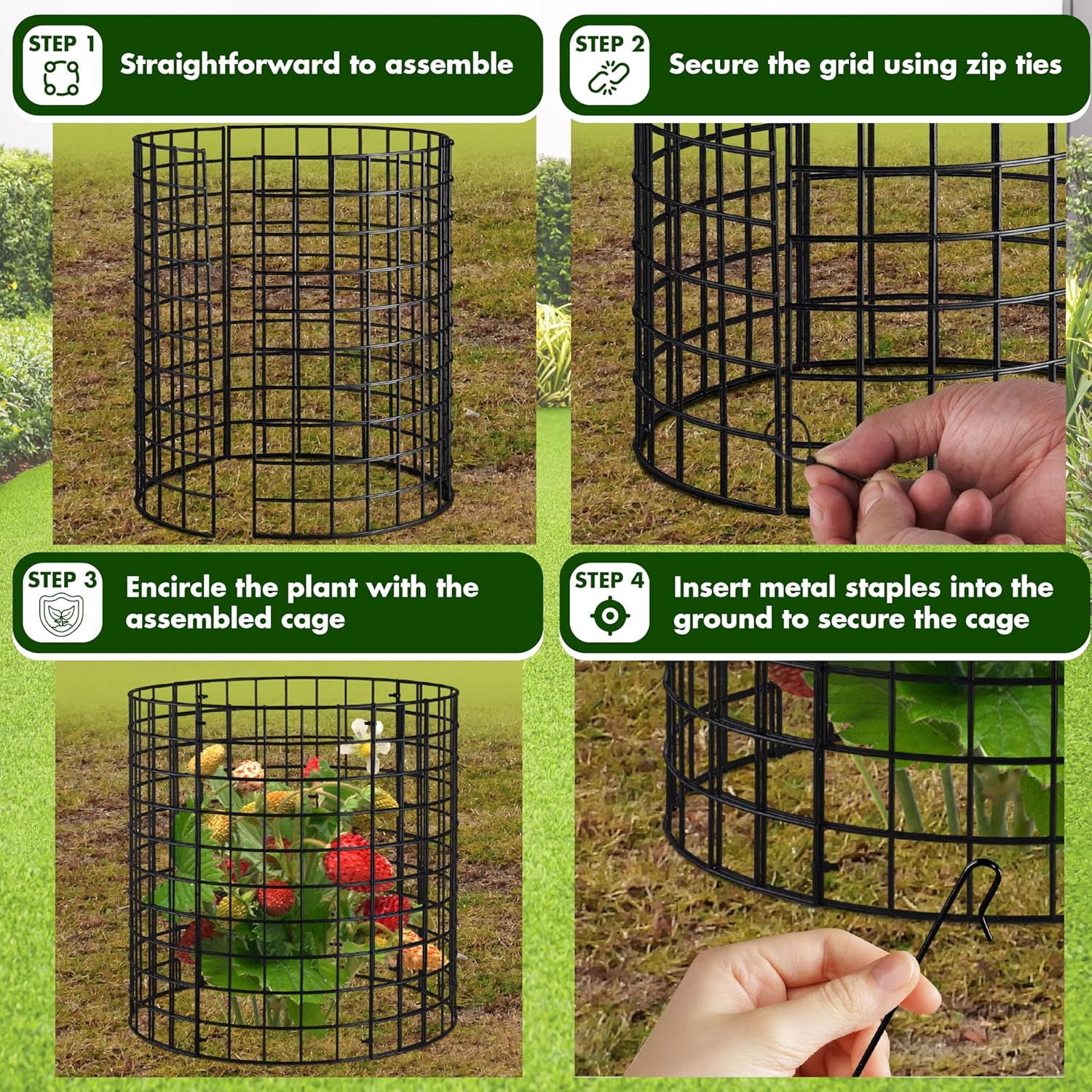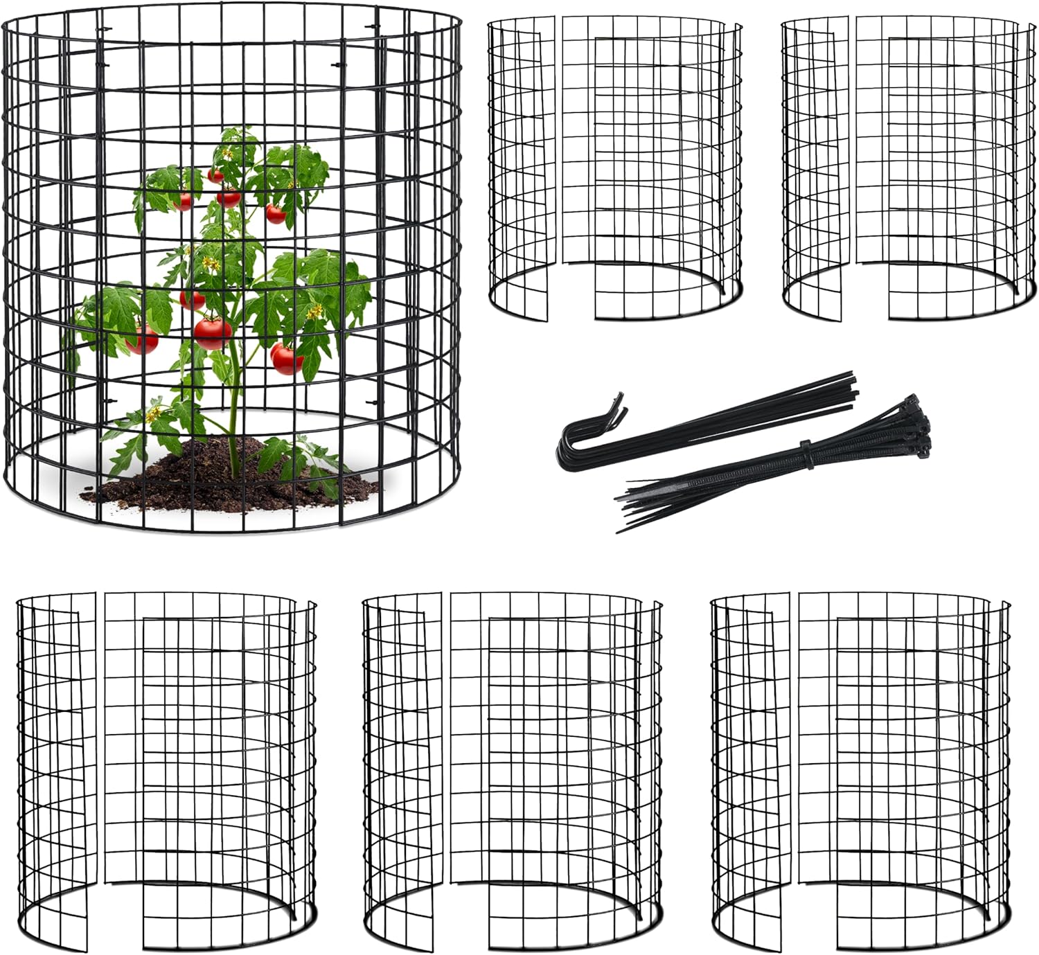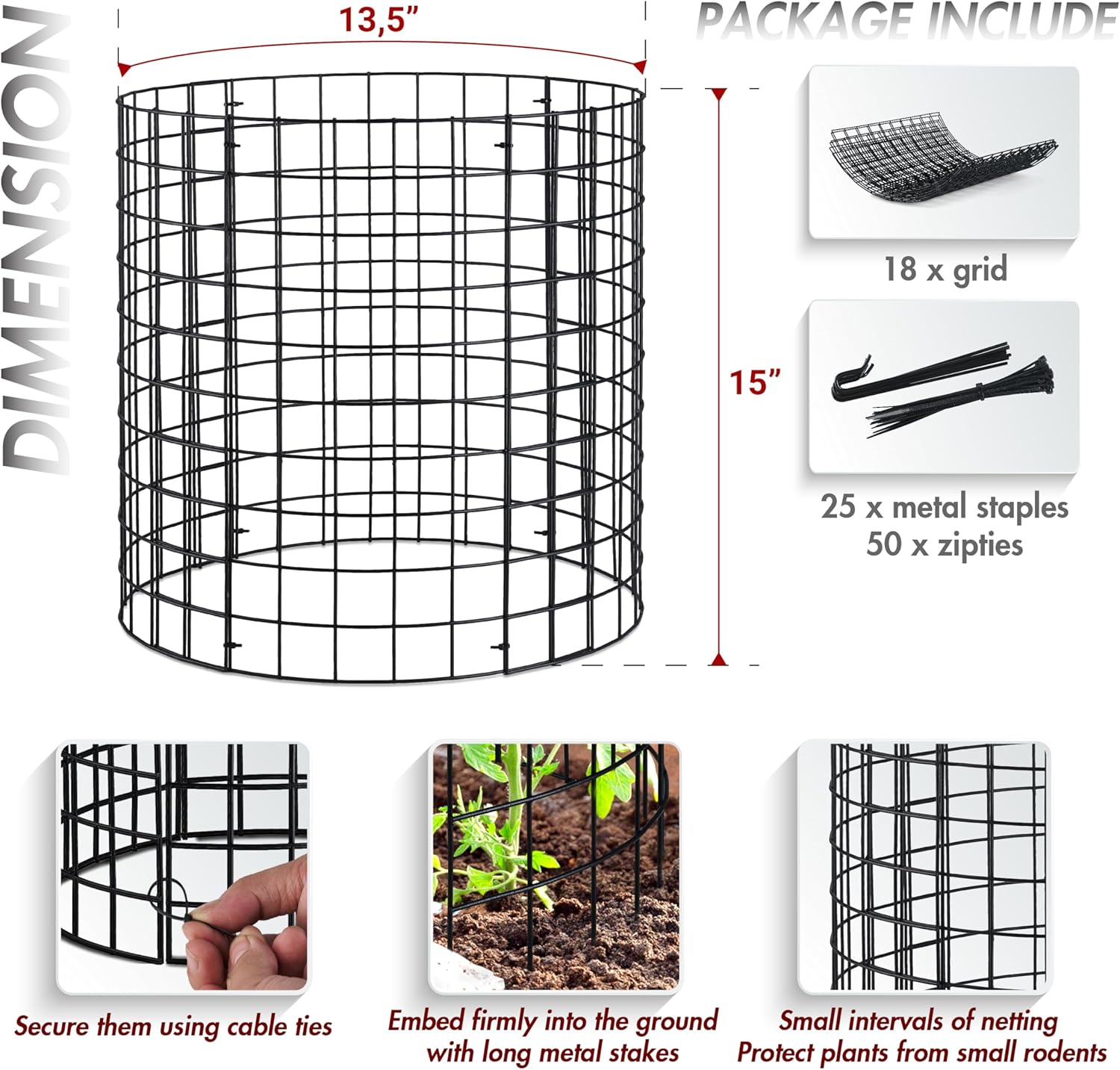 - πΏ Set of 6 Cage Flexible Garden Protection: The wire plant protector kit is designed for both indoor and outdoor use, protecting against environmental elements and animals. It includes 18 mesh panels, 25 ground staples, and 50 zip ties, with each cage measuring 13.5'' in diameter by 15'' in height after assembly. The system allows for the combination of three or more meshes to accommodate larger plants, ensuring ample space for growth and featuring removable grids for convenient storage.