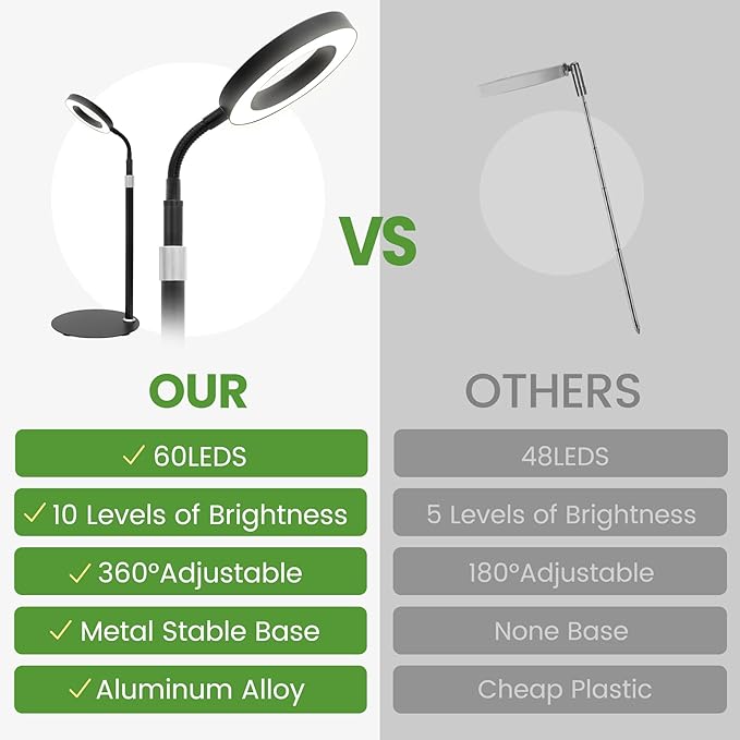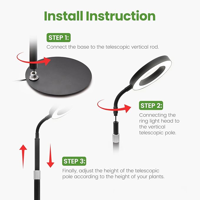 - Easy to Use & Height Adjustable: The halo grow light with an adjustable telescopic rod, you can easily adjust its height from 13.7" to 24.2", with a 360-degree flexible gooseneck, can adjust the angle and direction of the grow lamp to ensure that every part of the plant gets the best light it needs to grow. Plant lights for indoor growing are simple to use