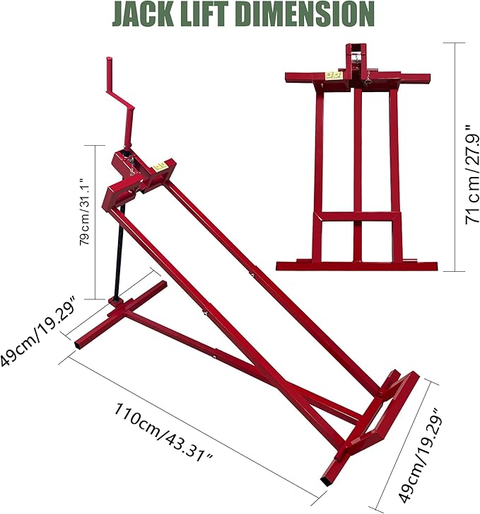 - ☪【Easy to Use】:The upgraded tool features a manual handle and a power tool extension handle, allowing you to lift the mower with this tractor jack in just seconds, making operation easy and time-saving. The tilt angle can be up to 45°, and different heights can be adjusted for different equipment types.