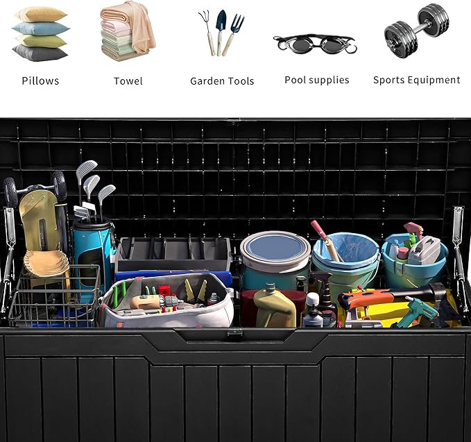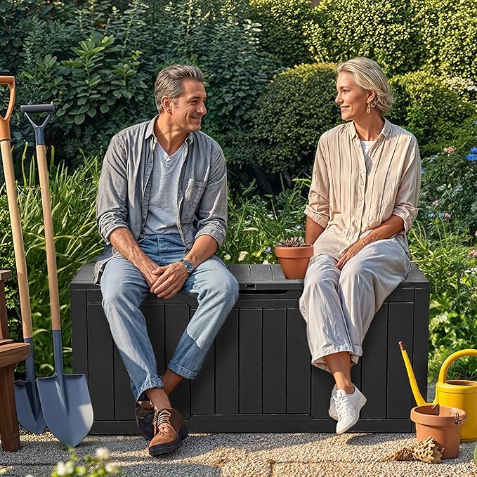 - Versatile Garden Storage: This resin deck box serves as an additional table or bench that can accommodate two peoples weighing up to 300 pounds total; It seamlessly blends into any yard or patio, and conveniently stores outdoor patio furniture cushions, tools, rain gear, and pool supplies