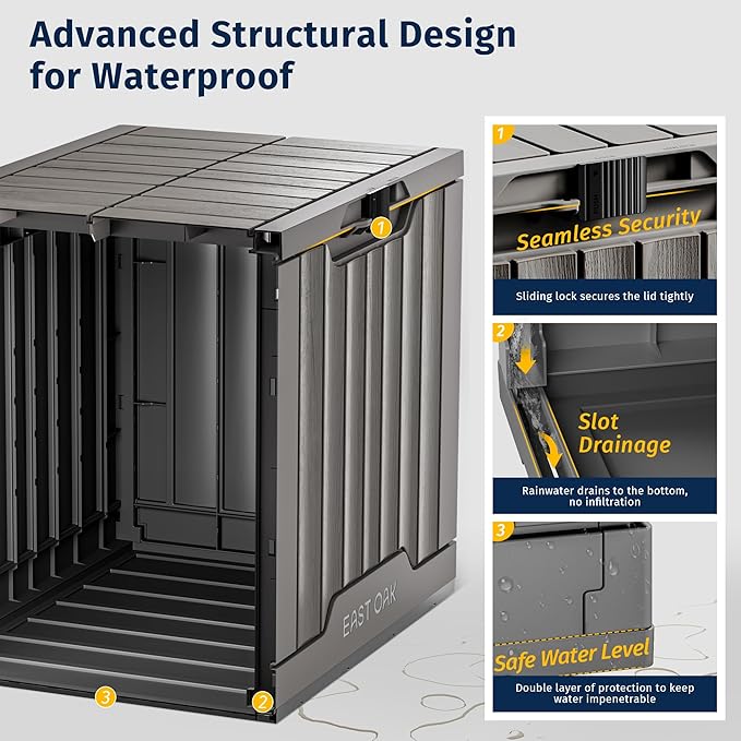 - ๐ช๐ฒ๐ฎ๐๐ต๐ฒ๐ฟ๐ฝ๐ฟ๐ผ๐ผ๐ณ ๐ฅ๐ฒ๐๐ถ๐ป: EAST OAK outdoor storage box, made from advanced resin material (SGS 1000+), ensures durability and weather resistance. This guarantees a fade-proof exterior and a dry interior, regardless of the weather.