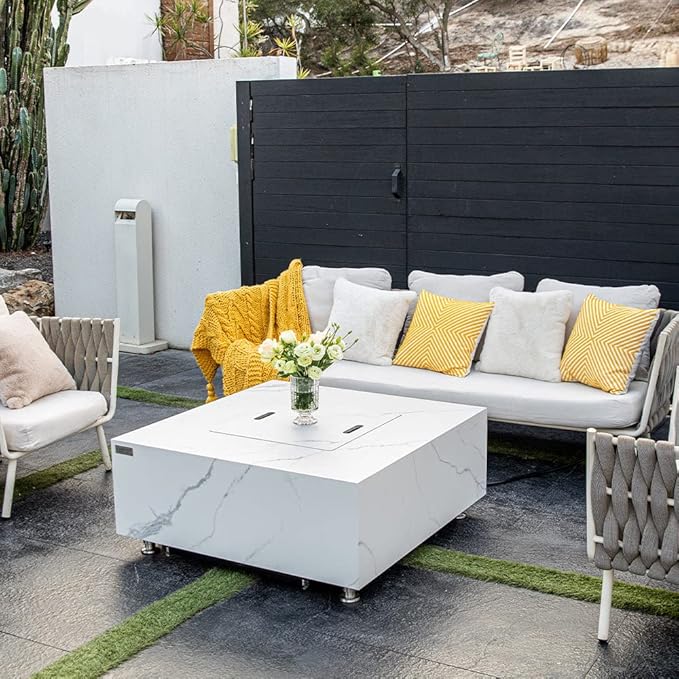 Bianco Marble Fire Pit 39.4" x 39.4" Outdoor Patio Firepit Includes Fire Glass Modern Fire Pits & Outdoor Fireplaces for Garden, Deck, Indoor & Outdoor Heating