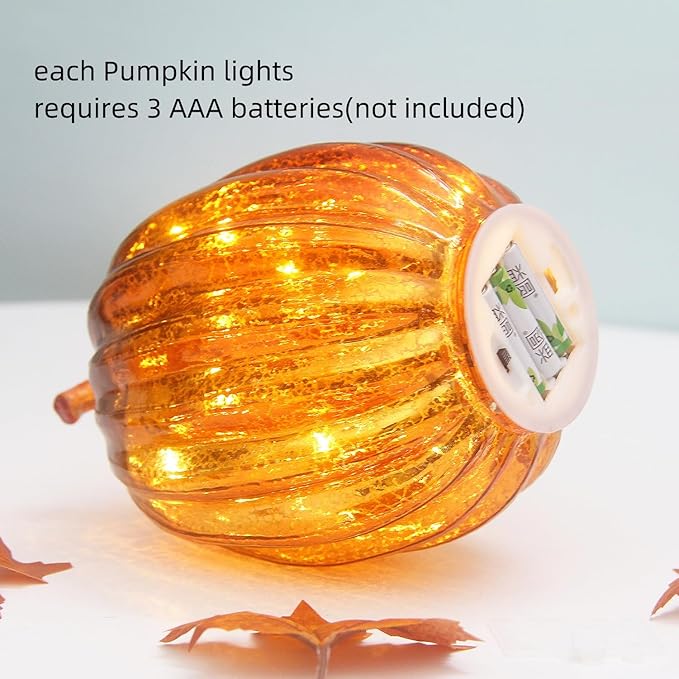 - 【SAFE TO USE AROUND CHILDREN AND PETS】Each Pumpkin Light requires 3 AAA batteries (Not Included). A string of LED lights inside shows off the mercury glass with a harvest of color. Battery operated Pumpkin lights without real fire. Never worry about fire-related accidents again. Safe to use around children and pets.