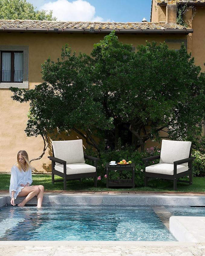 SERWALL HDPE Patio Sofa Set, 3-Piece Sectional Outdoor Furniture Set, All Weather Outdoor Couch Set Patio Furniture Set for Deck, Lawn, Black Frame with Khaki Cushion